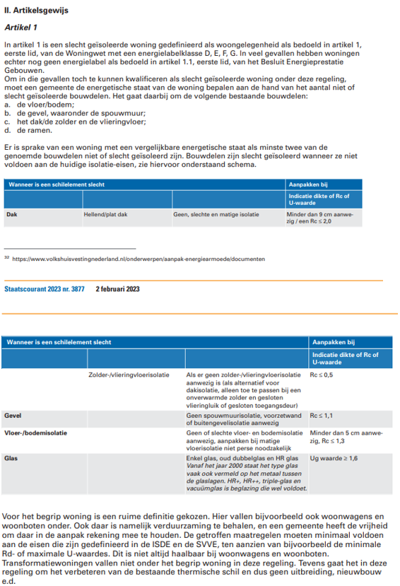 slecht geïsoleerde woning: woning met een energielabelklasse D, E, F, G of een met die labelklassen vergelijkbare energetische staat, waaronder wordt verstaan een woning waarin ten minste twee van de volgende bestaande bouwdelen, gelet op de criteria uit bijlage 1, niet of slecht geïsoleerd zijn: