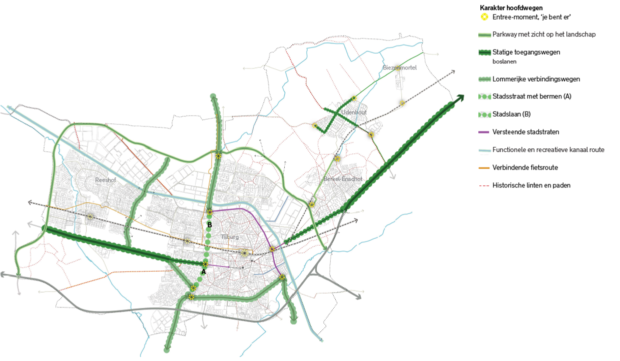 De belevingswaarde van de infrastructuur van Tilburg is zeer divers en kent verschillende kwaliteiten. Lange belevingslijnen verbinden de wijken met het landschap en de regio. Het markeren van entrees versterkt de identiteit van wijk of gebied en draagt bij aan de belevingswaarde.