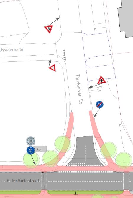 dat de kruispuntaansluiting van de Twekkeler Es op de H. ter Kuilestraat wordt heringericht zodat voor fietsers een logische en goed berijdbare aansluiting op de verplichte fietspaden ontstaat;