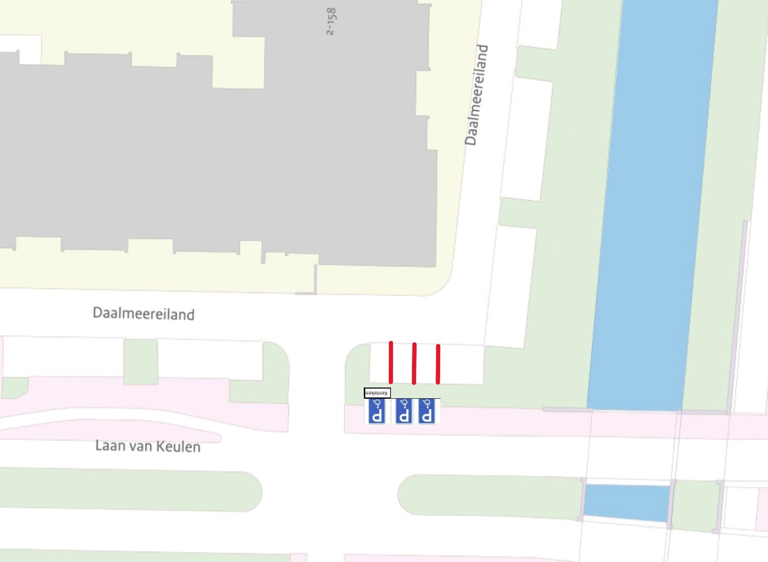 de twee parkeerplaatsen ten oosten van de inrit van het parkeerterrein in de Daalmeereiland beide één vak naar links te verplaatsen door het verplaatsen van de borden E6 van het RVV 1990;