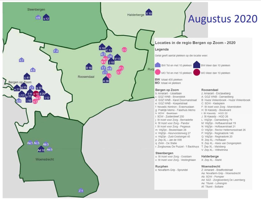 Zoals te zien is op bovenstaande afbeelding zijn de meeste BW-voorzieningen gelegen in de gemeenten Bergen op Zoom en Roosendaal.