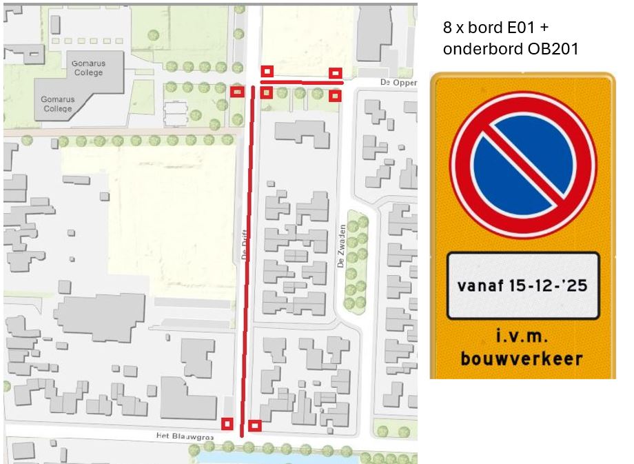 • 1 tot het instellen van een tijdelijk parkeerverbod van 15 december 2025 tot 1 juli 2027 aan De Drift tussen De Oppers en Het Blauwgras en aan De Oppers tussen De Drift en De Zwaden;
