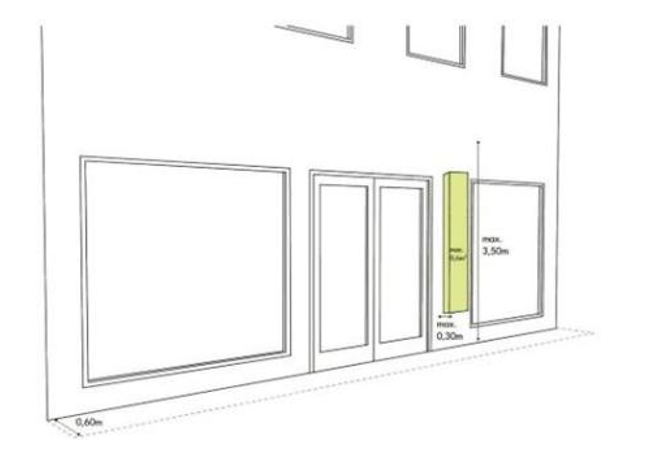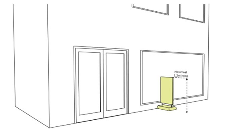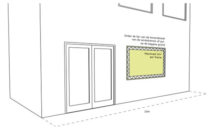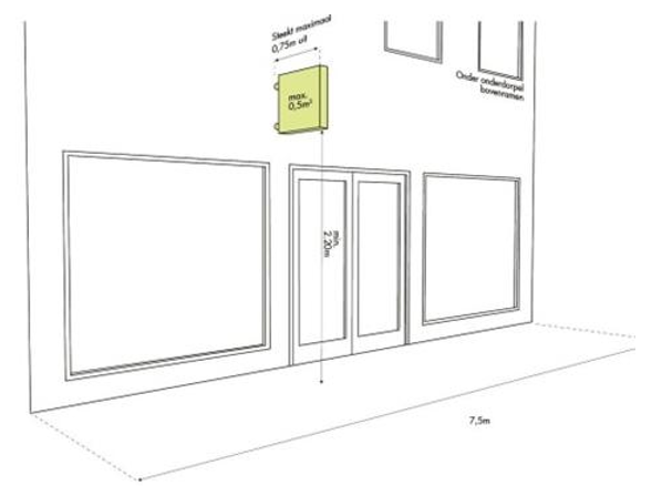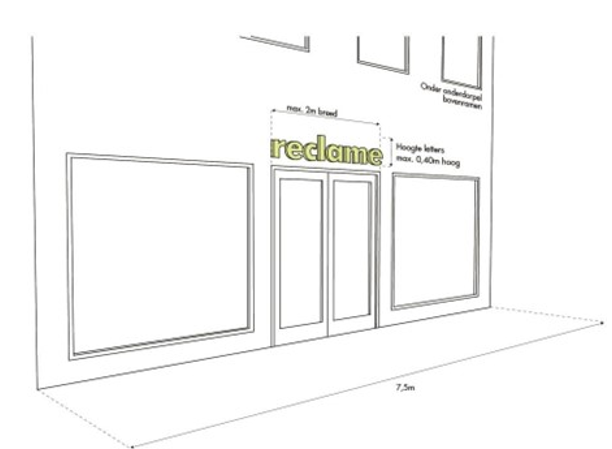 De regel is dat bij panden die smaller zijn dan 7,5 m zijn één reclame-uiting aan de gevel is toegestaan.