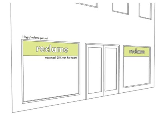 Reclame is afgestemd op de detaillering, maat, materialisatie en kleurstelling van de pui en het Pand.