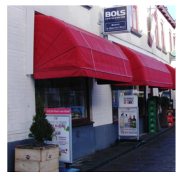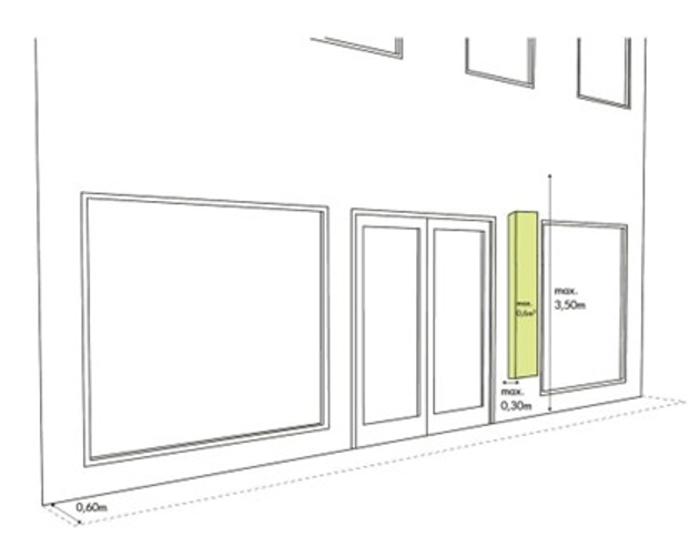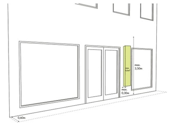 Voor een hoekpand worden de voorgevel en de bewinkelde zijgevel opgeteld als strekkende meter gevel. Bijvoorbeeld: aan de voorgevel van 7 m breed kan één van de getoonde reclame vormen geplaatst worden en aan de bewinkelde zijgevel van 5 m breed kan ook één van de getoonde reclamevormen geplaatst worden.