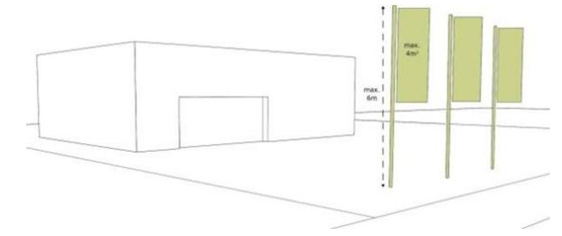 Buiten de bebouwde kom zijn per vestiging drie reclame-uitingen toegestaan. Combinatie naar keuze uit de getoonde reclamevormen in paragraaf 4.2, bijvoorbeeld één uithangbord, één vrijstaand bord en één vlag.