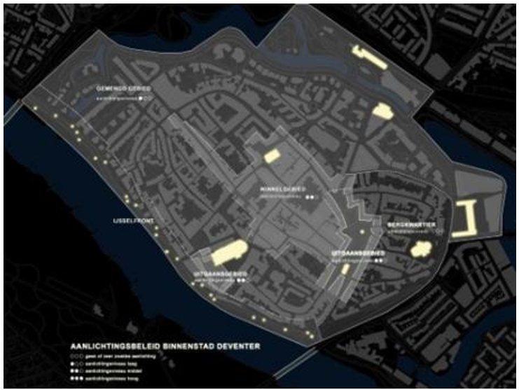 Voor de binnenstad zijn in het aanlichtingsbeleid gebieden met een hoog, midden en laag aanlichtingsniveau aangegeven (zie navolgende tekening). De monumentale, grote gebouwen worden met een hoog aanlichtingsniveau de stralende middelpunten in de omgeving. Incidenteel kunnen bijzondere panden op een zorgvuldig ontworpen manier worden aangelicht.