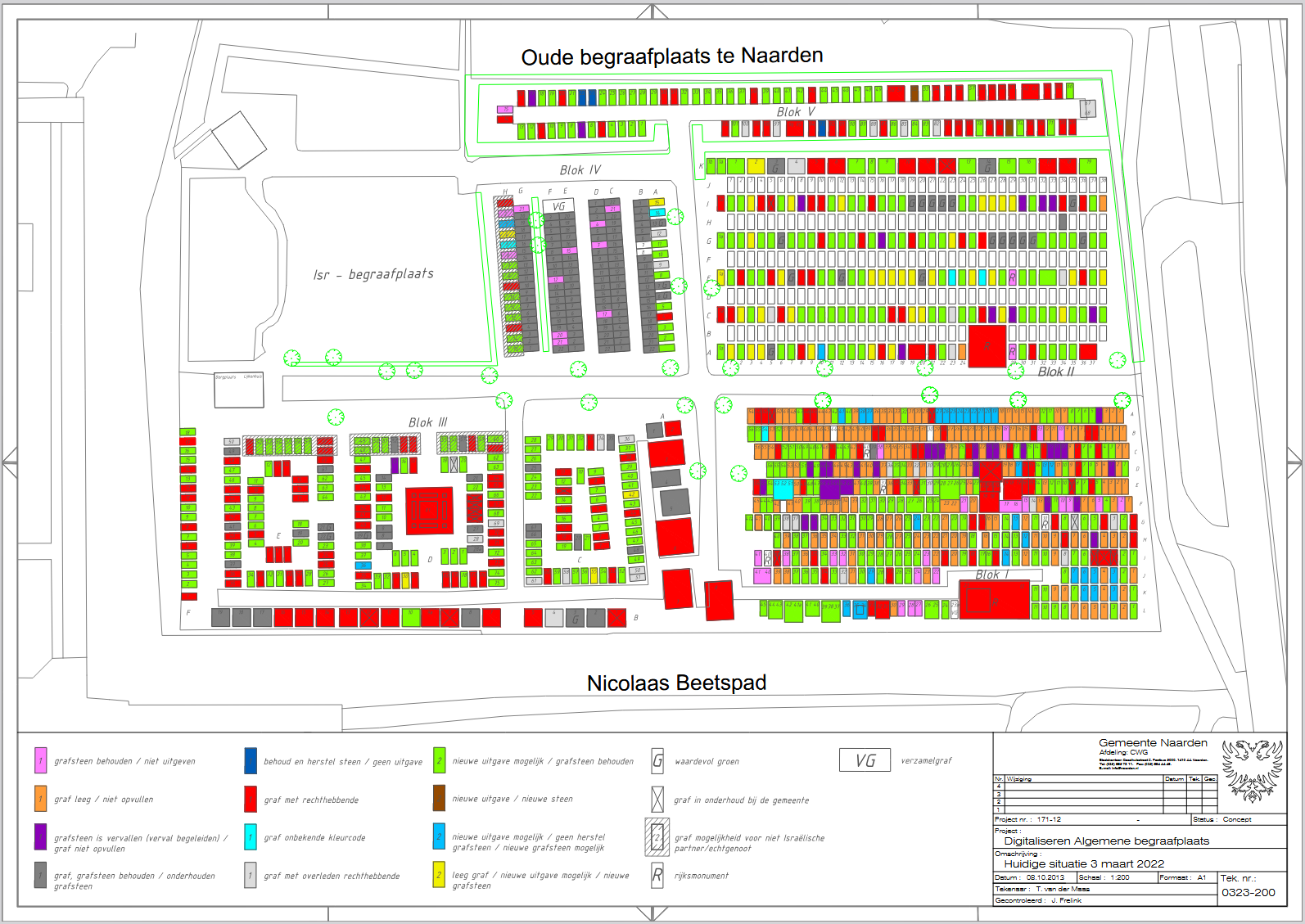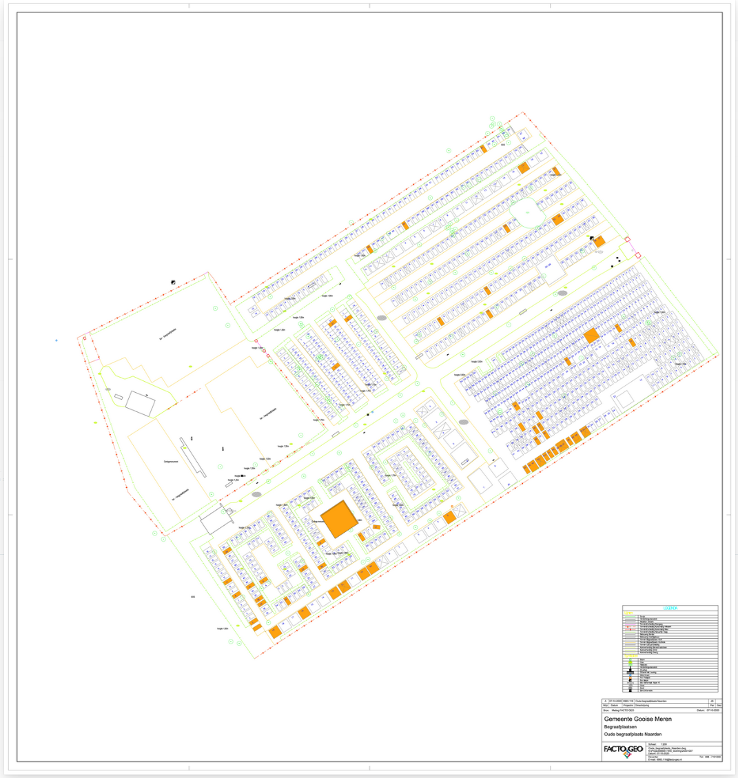 In onderstaande afbeelding is de grafkaart met codering opgenomen. Op deze kaart is per graf aangegeven welke kleurcode het graf heeft. Deze informatie is ook in de begraafplaatsadministratie opgenomen. De kaart is dynamisch en wordt met enige regelmaat geactualiseerd bijvoorbeeld omdat afstand wordt gedaan van een graf of juist een graf wordt uitgegeven en een nieuwe rechthebbende krijgt (kleurcode rood).