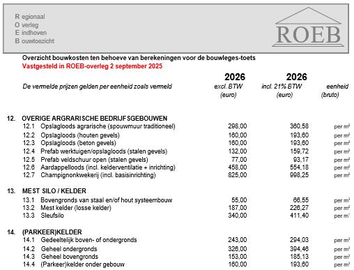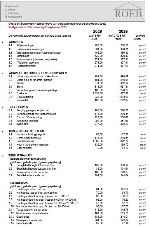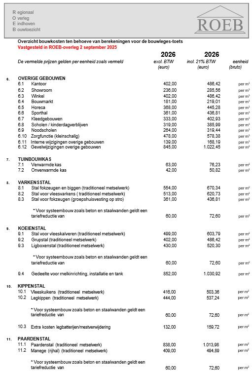 - bouwkosten: bij het bepalen van de hoogte van de bouwkosten wordt uitgegaan van de prijzen per eenheid zoals die jaarlijks worden vastgesteld door het ROEB (Regionaal Overleg Eindhoven Bouwtoezicht) zoals gevoegd bij deze tarieventabel als bijlage 1. Indien de bouwkosten niet kunnen worden bepaald aan de hand van de hiervoor genoemde bijlage 1 omdat de bouwwerken qua functie niet passen of niet voorkomen binnen de normatieve bouwkosten van bijlage 1 geldt dat onder de bouwkosten wordt verstaan: de aannemingssom exclusief omzetbelasting, bedoeld in paragraaf 1, eerste lid, van de Uniforme administratieve voorwaarden voor de uitvoering van werken en van technische installatiewerken 2012 (UAV 2012, Stcrt. 1567), voor het uit te voeren werk, of voor zover deze ontbreekt een raming van de kosten die voortvloeien uit aangegane verplichtingen ten behoeve van de fysieke realisatie (het bouwen) van de bouwwerken, exclusief omzetbelasting of als het bouwen geheel of gedeeltelijk door zelfwerkzaamheid geschiedt, de prijs die aan een derde in het economisch verkeer zou moeten worden betaald voor het tot stand brengen van het bouwwerk waarop de aanvraag betrekking heeft.