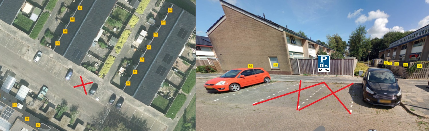 De laadpaal wordt geplaatst in het midden tussen twee parkeerplaatsen. Bij het kiezen van een nieuwe oplaadlocatie dient rekening gehouden te worden met de volgende criteria: