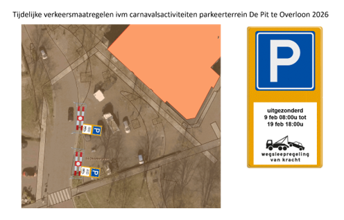 Het instellen van een parkeerverbod op de parkeerplaatsen aan het parkeerterrein bij De Pit te Overloon middels bebording te plaatsen van bijlage 1 van het Reglement Verkeersregels en Verkeerstekens 1990 volgens model E4, met de uitzondering voor 9 februari 2026 08:00 uur tot en met 19 februari 2026 18:00 uur.