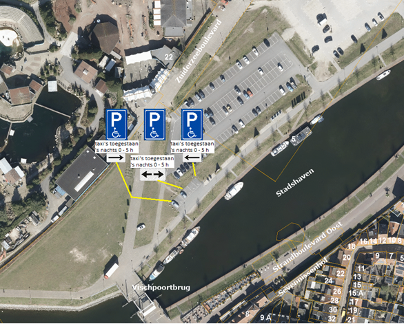 Aan het eind van de Zuiderzeeboulevard zijn zes gehandicaptenparkeerplaatsen aanwezig. Deze worden hoofdzakelijk overdags gebruikt door bezoekers van de boulevard en/of het Dolfinarium. Het is dus mogelijk deze gehandicaptenparkeerplaatsen een dubbelfunctie te geven. Door deze plekken te voorzien van het bord E5 (taxistandplaats) met onderbord ‘'s nachts 0-5 uur’ mag deze doelgroep hier ook gebruik van maken. Gedurende die tijden mogen deze voertuigen hier staan om passagiers in en uit te laten stappen. Deze locatiekeuze is tot stand gekomen in overleg met enkele buurtbewoners, boulevardondernemers, de politie en Koninklijk Horeca Nederland (team Harderwijk).