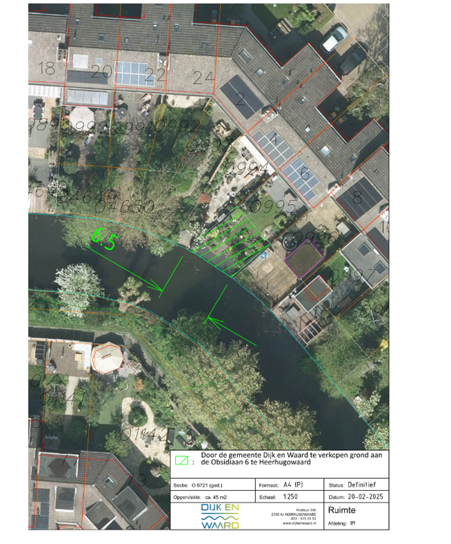 De gemeente Dijk en Waard is voor een tuinuitbreiding van plan om snippergroen kadastraal bekend als Heerhugowaard, sectie O, nummer 6721 (gedeeltelijk) ter grootte van 45 vierkante meter te verkopen aan de eigenaren van de aangrenzende pand aan de Obsidiaan 6, 1703 EN, Heerhugowaard.