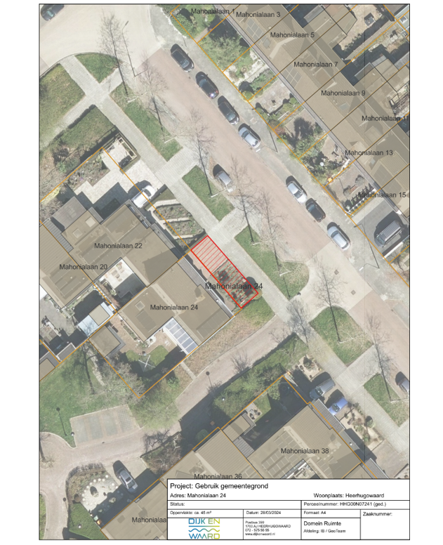De gemeente Dijk en Waard is voor een tuinuitbreiding van plan om snippergroen kadastraal bekend als Heerhugowaard, sectie N, nummer 07241 (gedeeltelijk) ter grootte van 45 vierkante meter te verkopen aan de eigenaren van de aangrenzende pand aan de Mahonialaan 24, 1702 XC, Heerhugowaard.