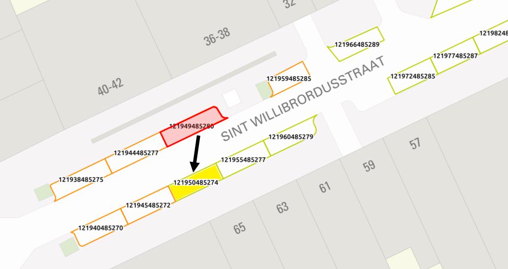 wegens het herbestemmen van een aantal parkeervakken, de bovengenoemde gehandicaptenparkeerplaats dient op te schuiven naar de overzijde van de straat, ter hoogte van perceel 65 (parkeervaknummer 121950485274);