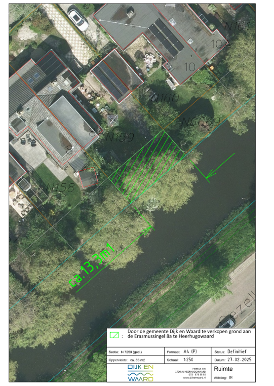 De gemeente Dijk en Waard is voor een tuinuitbreiding van plan om snippergroen kadastraal bekend als Heerhugowaard, sectie N, nummer 7250 (gedeeltelijk) ter grootte van 84 vierkante meter te verkopen aan de eigenaren van de aangrenzende pand aan de Erasmussingel 8A, 1702 ER, Heerhugowaard.