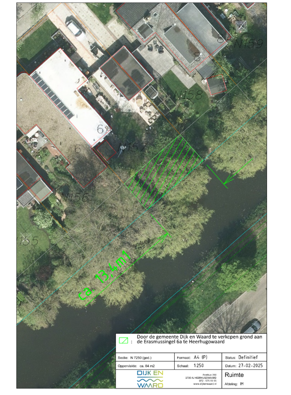 De gemeente Dijk en Waard is voor een tuinuitbreiding van plan om snippergroen kadastraal bekend als Heerhugowaard, sectie N, nummer 7250 (gedeeltelijk) ter grootte van 84 vierkante meter te verkopen aan de eigenaren van de aangrenzende pand aan de Erasmussingel 6A, 1702 ER, Heerhugowaard.