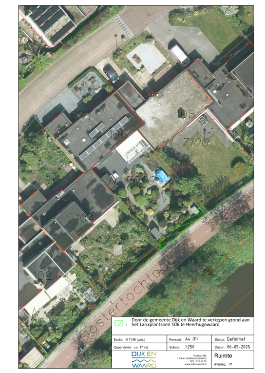 De gemeente Dijk en Waard is voor een tuinuitbreiding van plan om snippergroen kadastraal bekend als gemeente Heerhugowaard, sectie N nummer 7158 (gedeeltelijk) ter grootte van ca. 17 vierkante meter te verkopen aan de eigenaar van de aangrenzende woning aan de Larixplantsoen 106, 1702 XL Heerhugowaard.