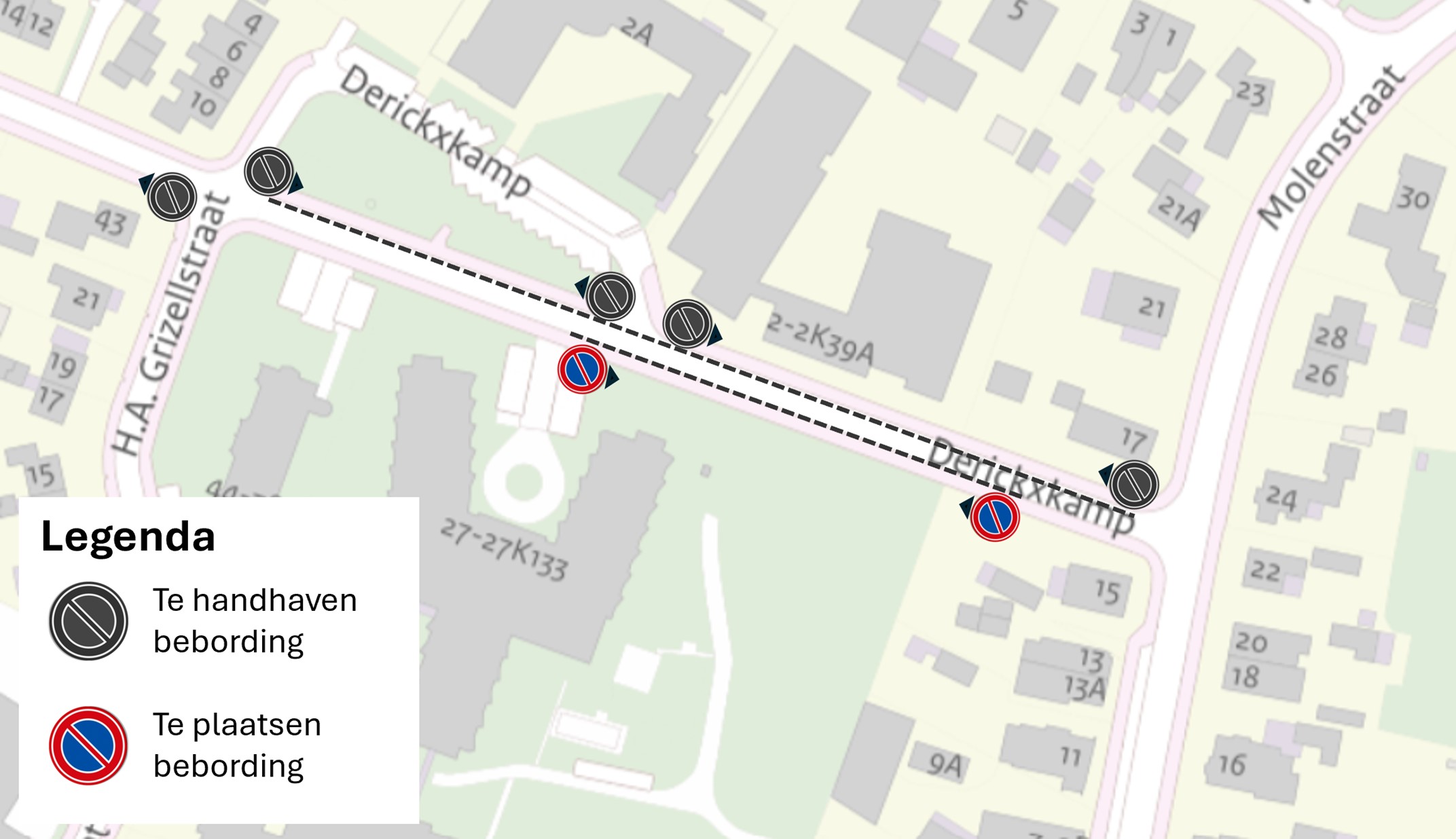 dat het daarom gewenst is om tijdelijk ook aan de zuidzijde van de Derickxkamp – tussen het parkeerterrein van Derickxkamp 27 (De Beekwal) en Derickxkamp 1 – een parkeerverbod in te stellen;