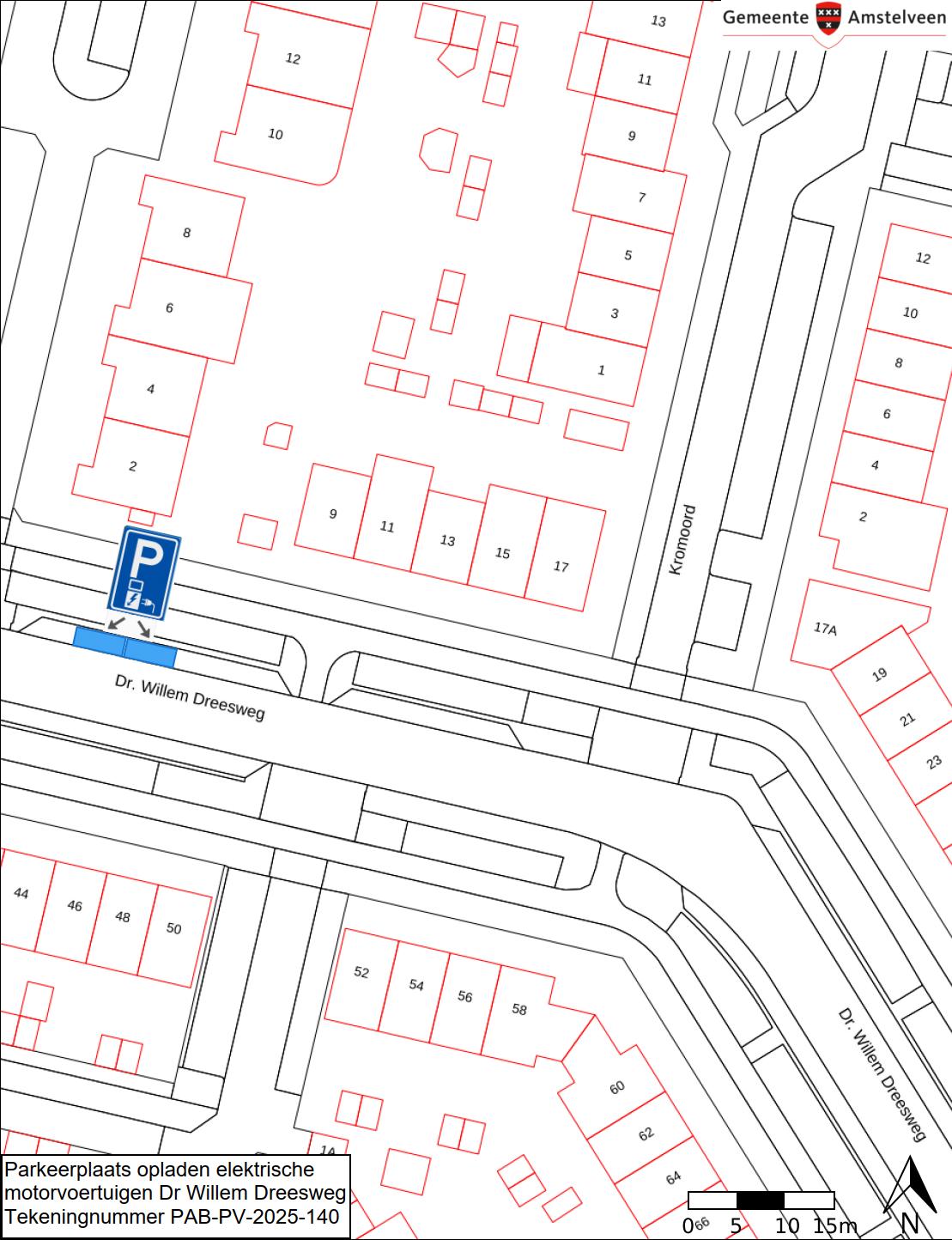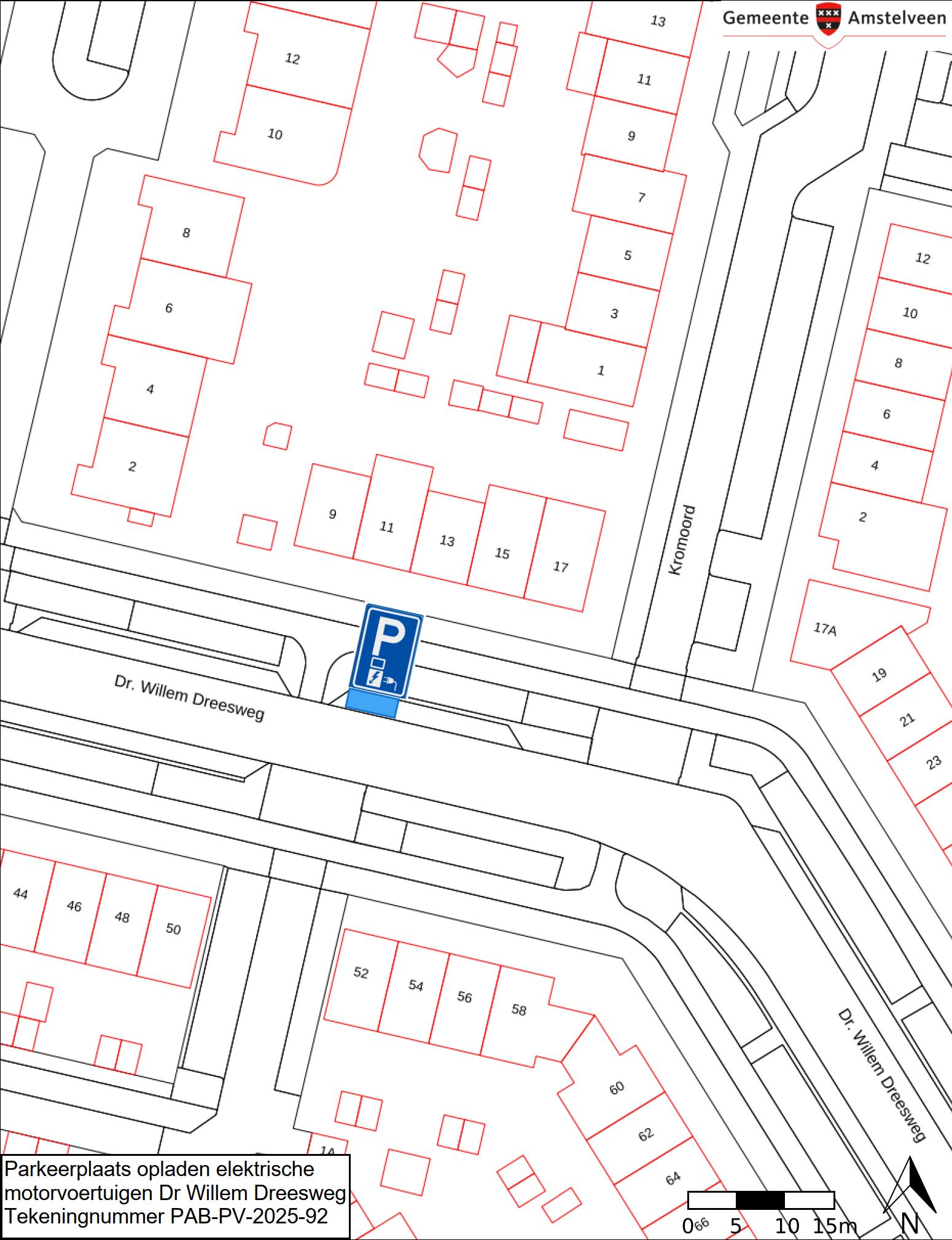 Burgemeester en wethouders van Amstelveen besluiten de locatie van de gereserveerde parkeerplaats voor het opladen van elektrische motorvoertuigen, zoals is vastgesteld in het besluit van 15 oktober 2025 (zaaknummer Z25-125239), gelegen aan de Dr. Willem Dreesweg te wijzigen. De huidige locatie van de gereserveerde parkeerplaats is weergegeven op de in dit besluit opgenomen tekening PAB-PV-2025-92. De openbare laadpaal is nog niet geplaatst waardoor in de praktijk niets veranderd.