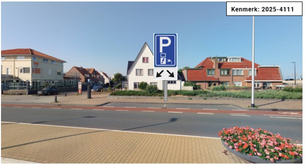 - dit bereikt kan worden door het plaatsen van verkeersbord E8c uit Bijlage 1 van het RVV 1990 met het onderbord OB504 (twee (2) pijlen ter aanduiding waar elektrische voertuigen opgeladen kunnen worden);