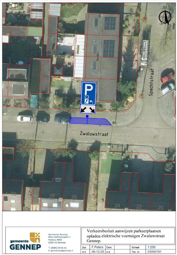 tot het aanwijzen van twee parkeerplaatsen bedoeld voor het uitsluitend opladen van elektrische voertuigen op de Zwaluwstraat in Gennep, in de parkeervakken naast woning Spechtstraat huisnummer 2, door het plaatsen van verkeersbord E08c met onderbord OB504 conform model van bijlage I van het Reglement Verkeersregels en Verkeerstekens 1990;