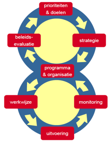 De bovenste regelkring betreft beleidskeuzen, strategie, het opstellen van een uitvoeringsprogramma en beleidsevaluatie. De onderste regelkring betreft het uitvoeringsprogramma en de professionele werkwijze, uitvoering en monitoring.