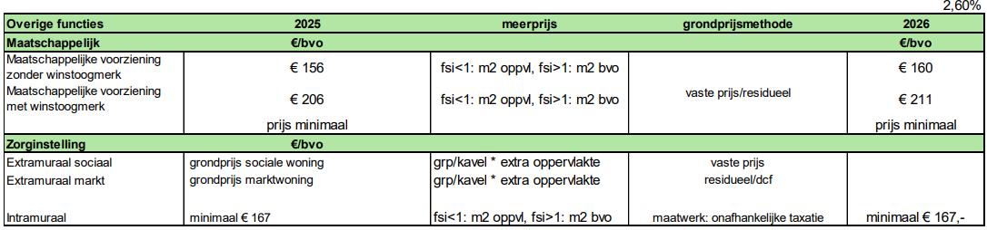 Bij de sociaal culturele en maatschappelijke voorzieningen moet gedacht worden aan bibliotheken, buurthuizen, niet-commerciële peuterspeelzalen, religieuze voorzieningen, brandweerkazerne en politiebureau. Voor deze categorie instellingen geldt een minimale grondprijs van € 156,- p/m² BVO.