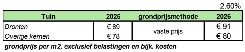 Omdat er slechts een klein aantal kavels nog is uit te geven voor de bedrijventerreinen Tarpan in Swifterbant (1 onder optie) en 4 in Poort van Dronten 1e fase, is de grondprijs geïndexeerd met 3% per 1 januari 2026.conform de inhoud van de bijbehorende kavelpaspoorten. Voor de 3 woonwerkkavels gelegen aan De Korenmaaier in Biddinghuizen zijn de grondprijzen niet geïndexeerd. De overhoeken grondprijs is geïndexeerd met 2,6%. Dit leidt tot de volgende grondprijzen: