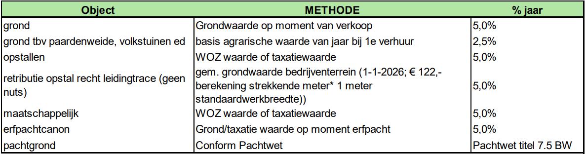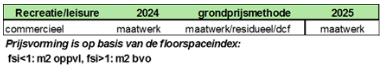 Voor de bepaling van de grondprijzen wordt in principe de residuele grondprijsberekening als rekenmethode gehanteerd waarbij de uitkomst wordt getoetst aan de prijzen gehanteerd door de omliggende gemeentes (comparatieve methode). Dit houdt in dat op basis van het gebruik/huursom de (beleggings-)waarde van het onroerend goed wordt bepaald. Hiervan worden de bouwkosten afgetrokken. Het verschil (residu) is de grondwaarde.