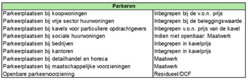 Bij woningen wordt de grondprijs van parkeren in het geval van een eigen parkeerplaats bij de opstalexploitatie inbegrepen. De grondwaarde van parkeren is zodoende verdisconteerd in de grondwaarde van de woning. Bij appartementen geldt dit ook als de parkeerplaatsen onder het gebouw worden gerealiseerd. Indien er parkeerplaatsen worden gerealiseerd buiten het gebouw in het uit te geven terrein, wordt er afhankelijk van de situatie (wel of niet openbaar te gebruiken) een grondprijs voor de parkeervoorzieningen in rekening gebracht. Openbare parkeerplaatsen worden in principe niet verkocht.