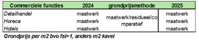 De grondprijzen voor detailhandel en horeca worden bepaald op basis van maatwerk. Een onafhankelijk taxateur zal meestal uitgaan van de residuele benadering, waarbij de locatie en de ligging van de winkel- horeca ruimte op de begane grond of verdieping, de branchering en de oppervlakte van invloed zijn op de grondprijs. Daarnaast vindt een toetsing plaats met de gehanteerde prijzen in de omgeving (comparatief).