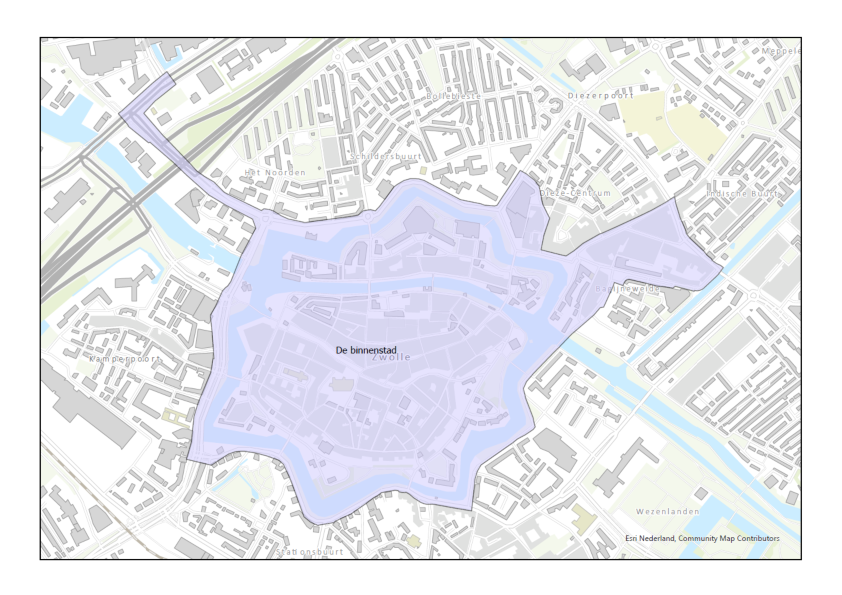 De binnenstad en directe omgeving daaromheen, gelegen binnen de as van de volgende wegen: Zwartewaterallee tussen Mozartlaan en Burgemeester Roelenweg, Burgemeester Roelenweg (inclusief groenstroken), Pannekoekendijk inclusief Katwolderplein, Harm Smeengekade, Emmawijk, Burgemeester van Roijensingel, Groot Wezenland, Schoenkuipenbrug, Bagijnesingel, Koewegje, Brink, Rhijnvis Feithlaan, Vechtstraat, Thomas a Kempisstraat, Diezerkade, Diezerplein, Braillestraat, Van Wevelinkhovenstraat, Burgemeester Drijberssingel en Schuttevaerkade.