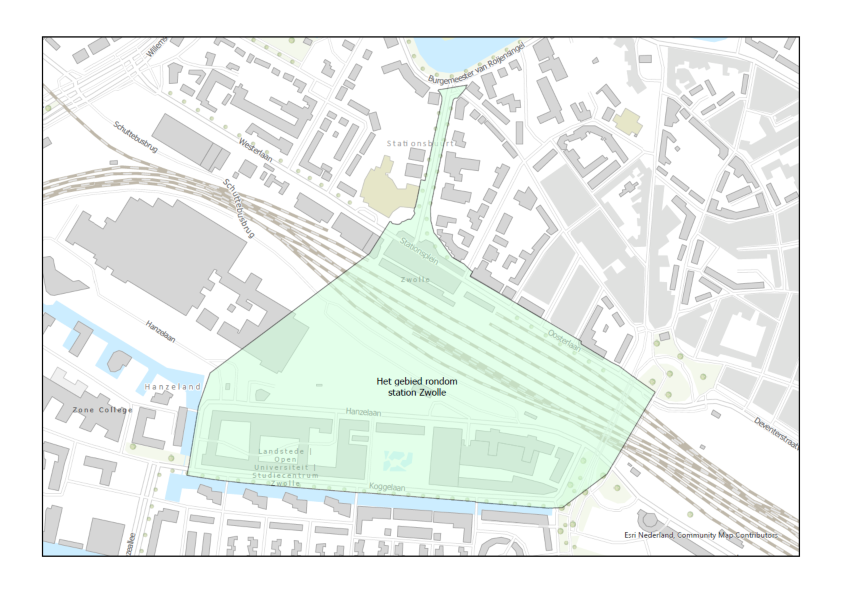 Het gebied rondom station Zwolle, gelegen binnen de as van de volgende wegen: Stationsweg, Westerlaan (tot aan voetgangersingang parkeergarage Stationsplein), Stationsplein, Oosterlaan (tot aan de Hoge Spoorbrug), Koggelaan, Hanzelaan.
