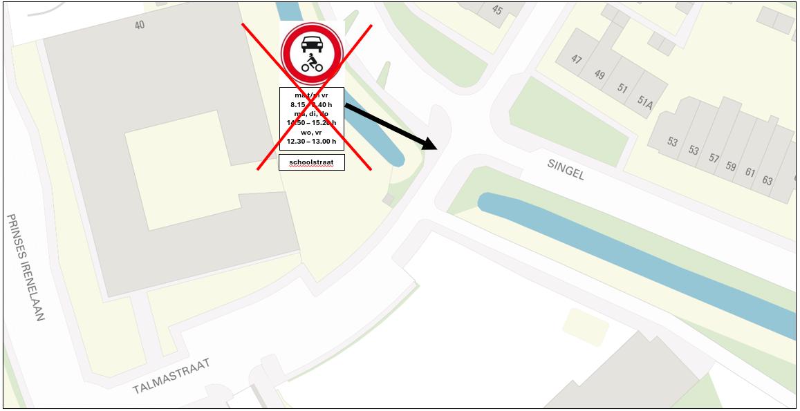 Door het verwijderen van verkeersbord conform model C12 van Bijlage I van het RVV 1990 inclusief onderborden met de tekst: ‘ma t/m vr 8.15 – 8.40 h / ma, di en do 14.50 – 15.20 h / wo en vr 12.30 – 13.00 h’ en ‘schoolstraat’, alsmede de ter ondersteuning toegepaste fysieke afsluiting in de vorm van een uitneembaar fietspaaltje, op te heffen: de geslotenverklaring voor alle motorvoertuigen in de Talmastraat, ter hoogte van de kruising met de Singel tijdens de op de onderborden vermelde venstertijden.