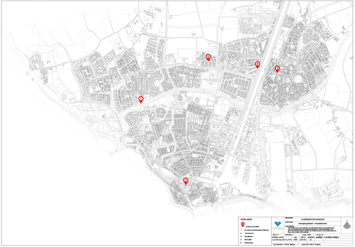 5 locaties, zoals aangegeven op bijlage 1, met aanplakborden voor het aanbrengen van bekendmakingen en meningsuitingen, die geen betrekking mogen hebben op handelsreclame of op bijeenkomsten waar men entree moet betalen.