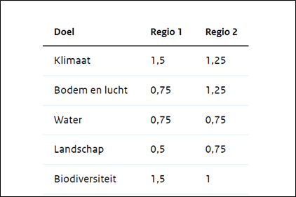 De eco-regeling heeft 2 regio’s met 8 gebieden. De gemeente Land van Cuijk behoort tot regio 1. De zuidelijke beekdalen en ontginningen. Onderstaande schema zijn de punten per doel, per regio.