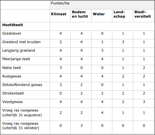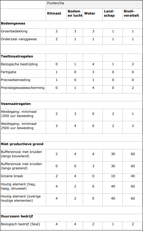 Daarnaast wordt een inschrijving op prijsniveau vervangen door een systematiek dat duurzaamheidsmaatregelen waardeert. Dit systeem sluit aan bij de reeds bekende regelingen van uit het gemeenschappelijk landbouwbeleid (GLB).