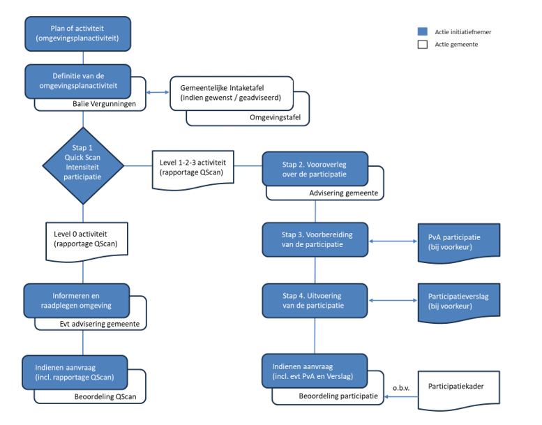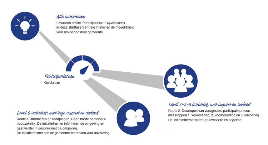 Via een online Participatiescan (quickscan), die wordt ingevuld door de initiatiefnemer, wordt de behoefte aan en intensiteit van de participatie (het gewenste participatielevel) op hoofdlijn gemeten: