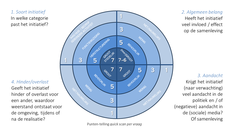 De gemeente biedt initiatiefnemers hiertoe een online tool, waarmee een eerste inzicht ontstaat op de impact van het initiatief en de verwachte participatie; met dit afwegingskader wordt onderscheid gemaakt in de zwaarte van de participatie op basis van de aard en omvang van het initiatief, de invloed op de samenleving, de maatschappelijke impact en hinder en overlast.