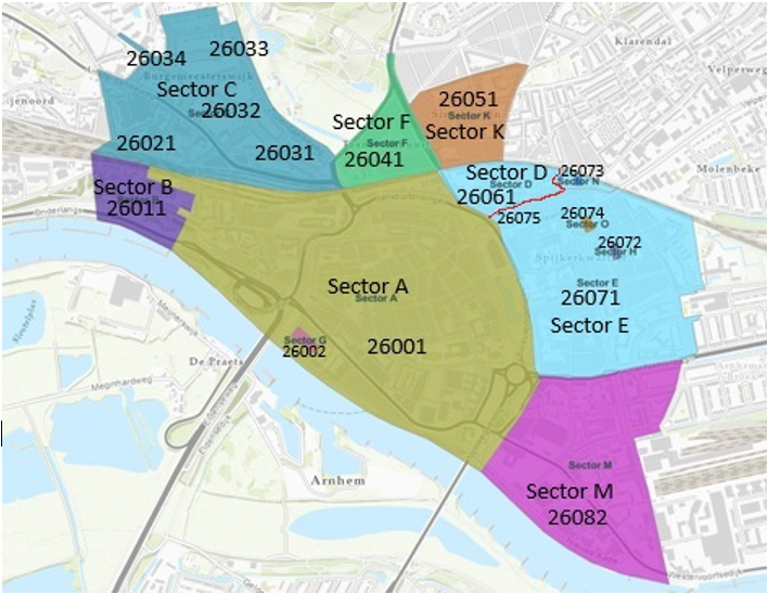 In de volgende kaart is weergegeven welke gebieden aangewezen zijn en welke administratieve sectors en gebieden hieraan zijn gekoppeld. In de tabel “beschrijving gebieden” zijn de straten of straatdelen benoemd die het gebied begrenzen.
