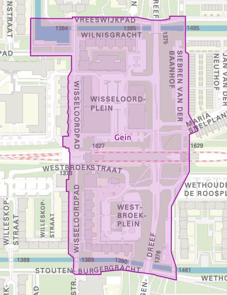 (aan de noordzijde) via het fietspad langs de Wilnisgracht ter hoogte van de zijstraat van de Willem Gertenbachstraat richting kruising fietspad ter hoogte van Wamelplein 91 en Wisseloord bij de brug 1384, waarbij deze wegen, zowel de even als de oneven zijde (tenzij anders aangegeven), deel uitmaken van het gebied;