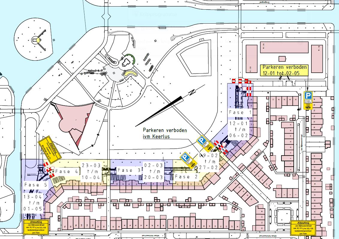 Door middel van het plaatsen van bord E04 met onderbord OB310, met de tekst “Parkeren verboden vanaf 12-01 werkzaamheden wegsleepregeling” tijdelijke parkeerverboden in stellen op de Jan Bijhouwerstraat. Dit ten behoeve van het creëren van ruimte voor keerlussen. De bijgevoegde afbeelding toont een voorbeeld van fase 1 (in totaal zijn er vijf fases). De parkeerverboden en de keerlus worden per fase verplaatst, conform de aanduidingen in de afbeelding. De parkeerverboden ter hoogte van Jan Bijhouwerstraat 58-60 blijven gedurende de gehele werkzaamheden op dezelfde locatie gehandhaafd.