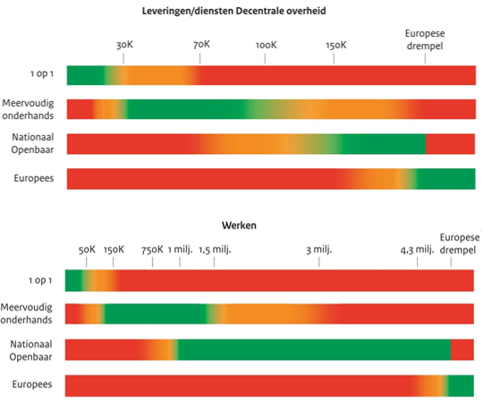 Gemeente Bladel zal per inkoop bepalen welke inkoopprocedure zij gaat doorlopen. De te doorlopen inkoopprocedure wordt onderbouwd in de inkoopstrategie. Hiervoor wordt onder andere gebruik gemaakt van voorschrift 3.4A van de Gids Proportionaliteit en onderstaande balkenschema’s, waarin de meest gangbare procedures zijn opgenomen. Gemeente Bladel kan ook andere dan de meest gangbare procedures toepassen.