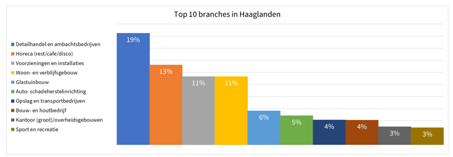 De top 10 branches van bedrijven die onder milieuwet- en regelgeving vallen staan in onderstaande figuur weergegeven.
