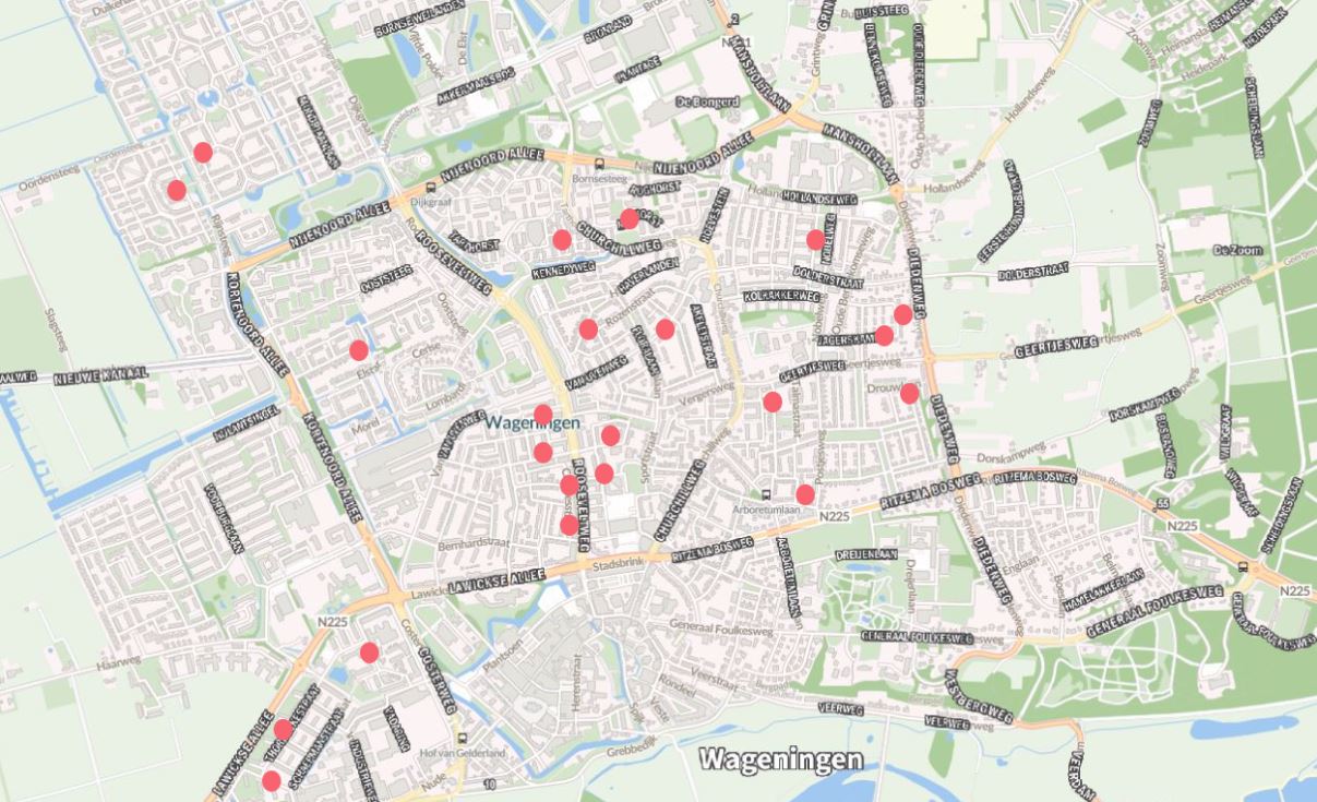 In deze afbeelding staan met rode circels de locaties aangegeven waar de gehandicaptenparkeerplaatsen ingetrokken worden.