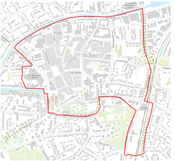 - Een overzicht van het gebied is opgenomen als bijlage 1 bij dit besluit. Het gebied dat begrensd wordt door de volgende straten en grachten, met inbegrip van de daarin gelegen voor het publiek openstaande gebouwen en daarbij behorende erven: Het Kanaal, Rolderstraat, Industrieweg, Overcingellaan, Hendrik de Ruiterstraat, Stationsstraat, het stationsgebied, Oostersingel, Zuidersingel, Collardslaan, Vaart Zuidzijde, Vaart Noordzijde, Weiersstraat, Keerweer, Alteveerstraat.