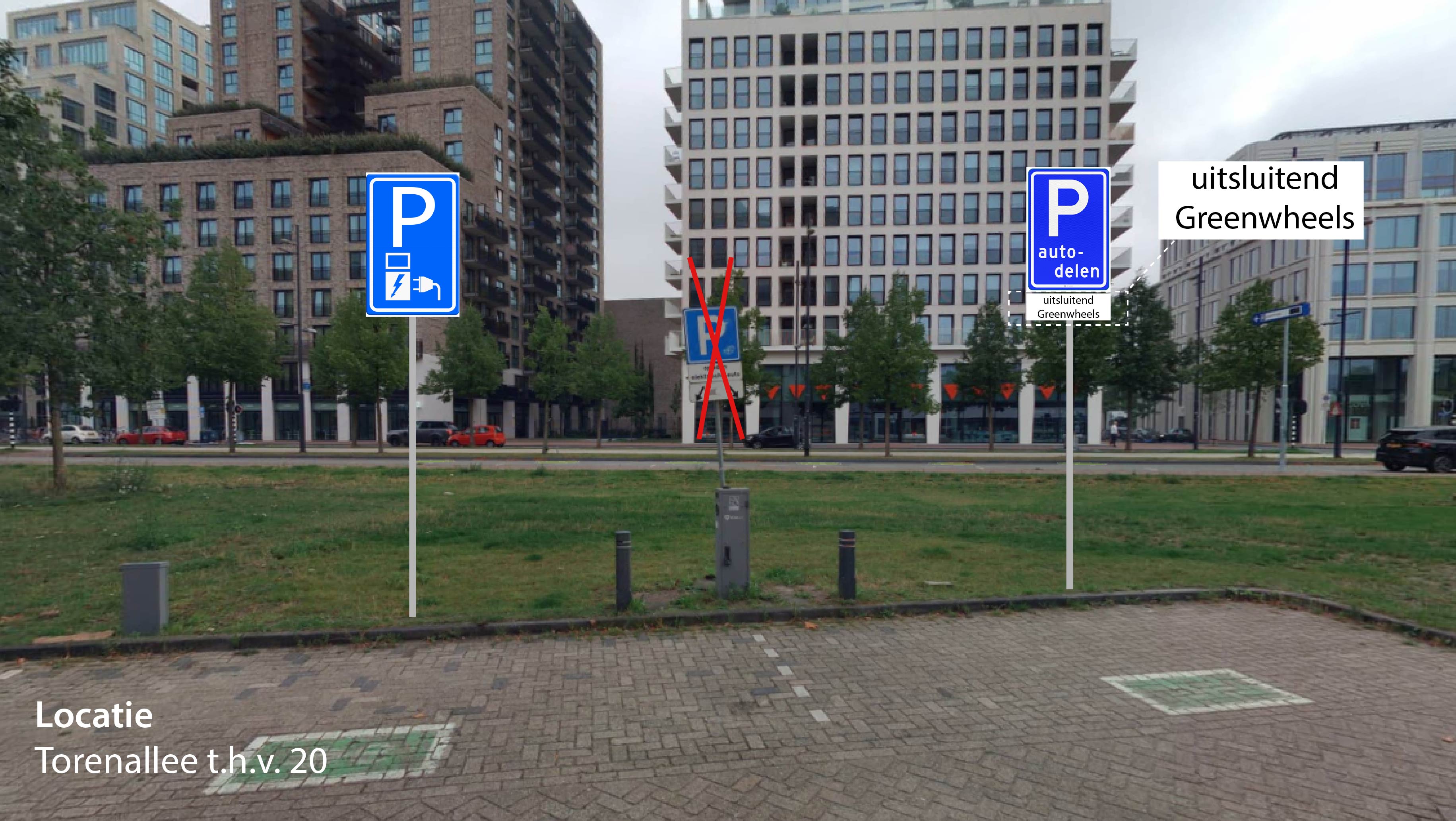 Feitelijk betekent dit het reeds geplaatste bord model E04 van het Reglement verkeersregels en verkeerstekens 1990 (RVV 1990) met, een onderbord “opladen elektrische auto” en een onderbord model OB 504 (schuine pijl links en/of rechts), wordt verwijderd. Bij het parkeervak dat bestemd blijft voor het laden van elektrische voertuigen wordt het bord E8c geplaatst. Bij het parkeervak dat is aangewezen voor een deelauto wordt het bord E8r wordt geplaatst met onderbord “Uitsluitend Greenwheels”.