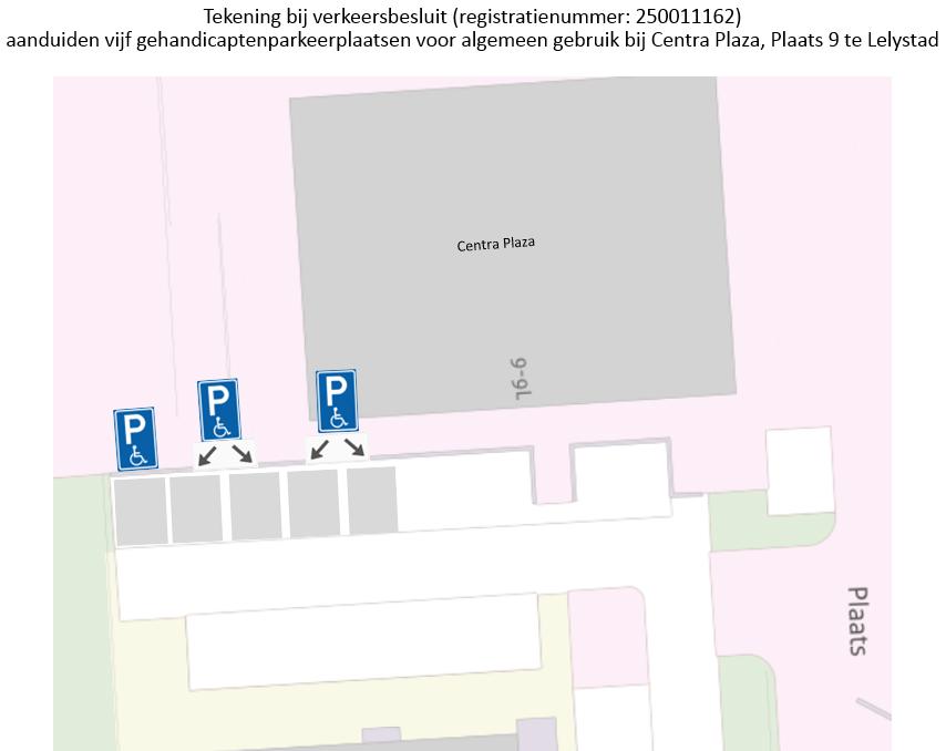 Verkeerbesluit aanduiden vijf gehandicaptenparkeerplaatsen voor algemeen gebruik bij Centra Plaza, Plaats 9 te Lelystad