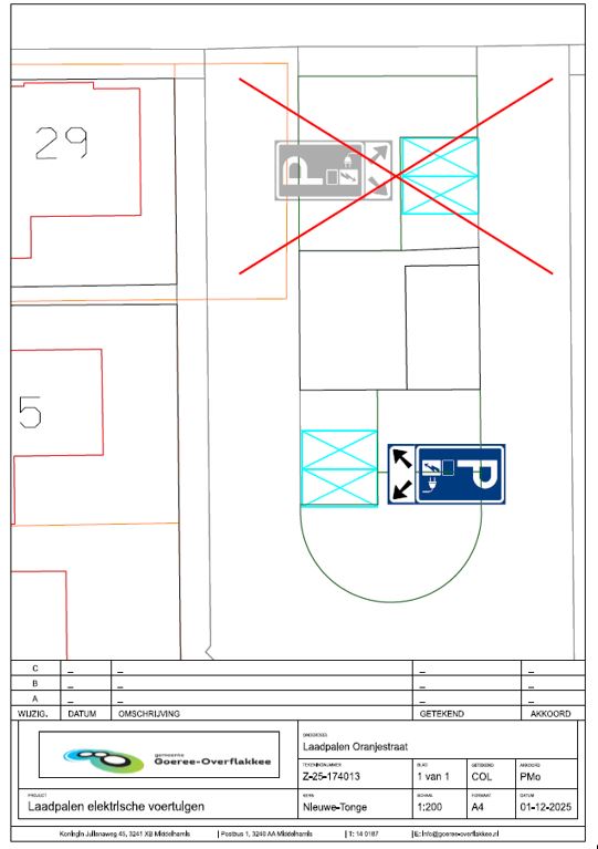 Bij besluit van 11 juli 2025 is besloten tot het aanwijzen van twee parkeerplaatsen bedoeld voor het uitsluitend opladen van elektrische voertuigen in de Oranjestraat te Nieuwe-Tonge, in de haakse parkeervakken tegenover de woning met huisnummer 13, door het plaatsen van verkeersbord E08c met onderbord OB504 conform model van bijlage I van het Reglement Verkeersregels en Verkeerstekens 1990. Dit besluit is bekendgemaakt in het gemeenteblad van 18 juli 2025, nummer 313891.